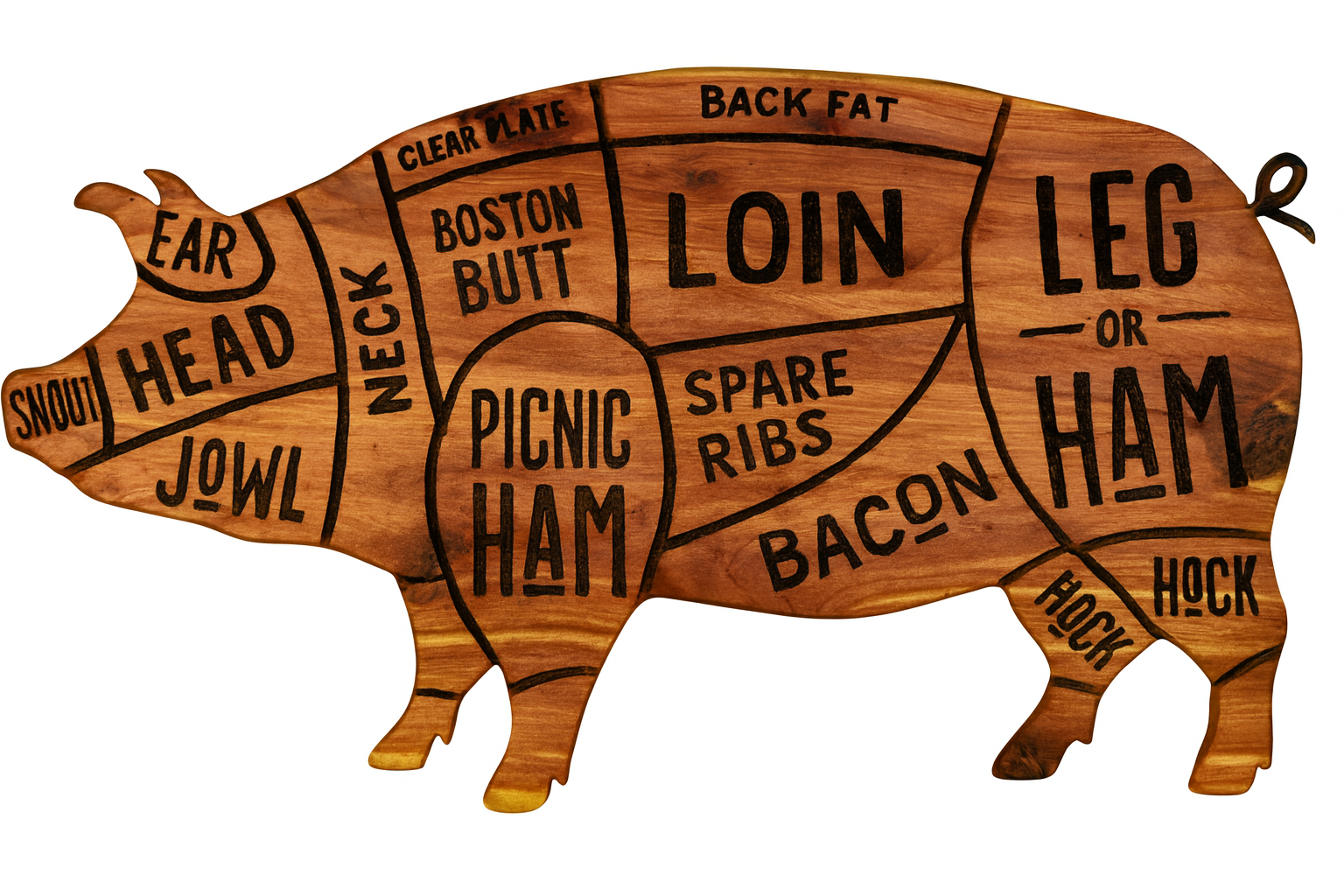 Measuring approximately 45 inches wide by 19 inches tall, this handcrafted pig butcher chart showcases the talents and resources of both campus and community. Made by one of UACCB’s own, the sign begins as Eastern red cedar logs harvested from the maker’s property, milled into lumber on a personal sawmill. The silhouette is precision-cut using the laser in UACCB’s Workforce Training Center, then finished in the maker’s home workshop. Each cut of pork is hand-painted in a rustic, distressed black, creating a warm, authentic farmhouse style. The natural beauty of the cedar grain makes this piece unique—perfect for kitchens, smokehouses, or barbecue enthusiasts who value craftsmanship with a story.