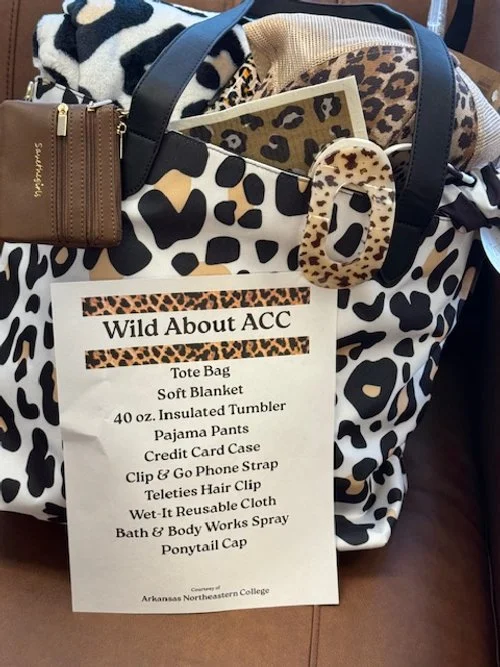 Wild about ACC Gift Basket. This adorable leopard tote is packed full of goodies including a blanket, insulated tumbler, pajama pants, credit card case, Clip & Go phone strap, Teleties hair clip, Wet-It reusable cloth, Bath & Body Works spray, and ponytail cap.