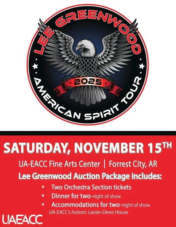 This raffle package includes two orchestra section tickets to the Lee Greenwood concert at the UAEACC Fine Arts Center on November 15, 2025. The package also includes dinner for two on the night of the show, and overnight accommodations at UAEACC’s historic Lanier-Dews House.