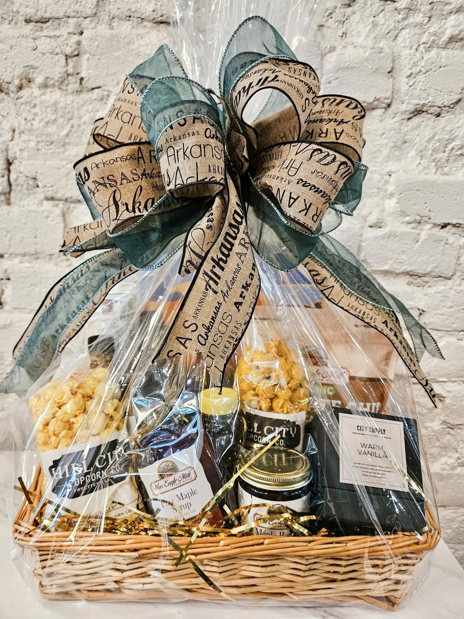 Taste of Northwest Arkansas Basket: Experience the charm and flavor of Northwest Arkansas with this curated basket of locally made favorites. Enjoy Wright’s signature BBQ sauce and seasoning, a cozy tea towel, pure local honey, Hill City Popcorn minis, War Eagle Mill pancake & waffle mix with syrup, a City Supply candle, and a handcrafted Arkansas mosaic cutting board—perfect for bringing a touch of NWA into your home.