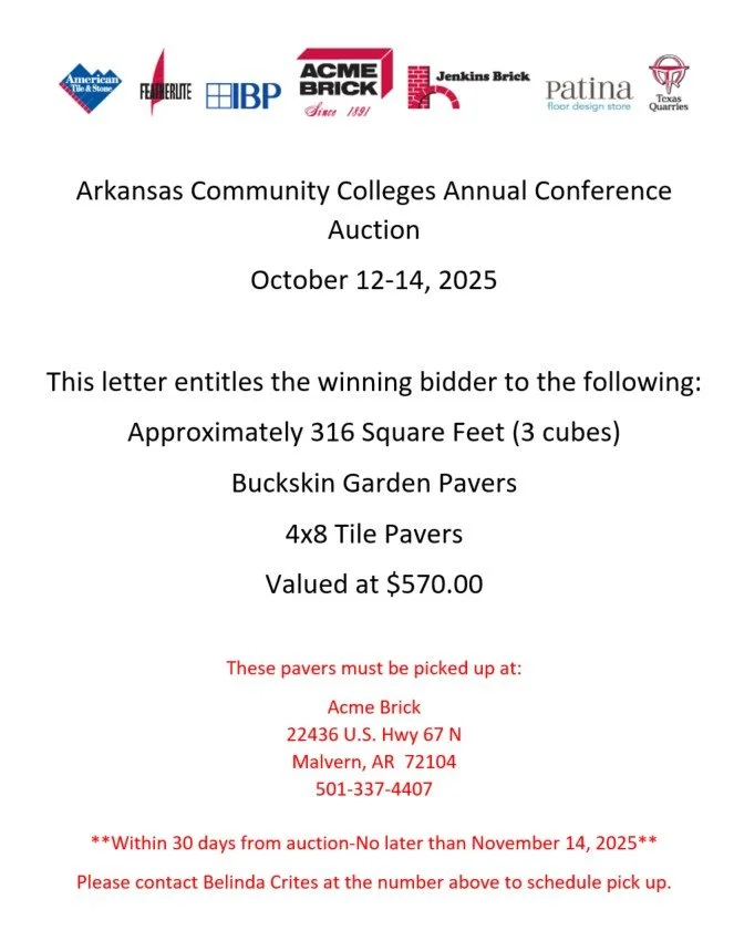 The Academic All-Star Raffle will be open on Monday, October 13, from 8 a.m. - 4 p.m. in the Hot Springs Convention Center Grand Lobby. Purchase tickets on site for $1 each for a chance to win items donated by ACC member colleges. Proceeds support the ACC Student Leadership Academy. Winners will be announced during the Networking Happy Hour from 4:15 - 4:45 p.m. Please be present or send a representative to claim your prize. Prizes will also be available for pickup on Tuesday, October 14, from 8 - 10 a.m. in Room 101.