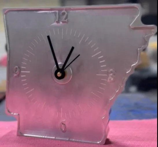 UACCM regional partner David Reed, of Reed Precision Manufacturing in Russellville, has created a custom-designed metal clock in the shape of Arkansas. The clock is 7.75” x 6.75” x 1”.
