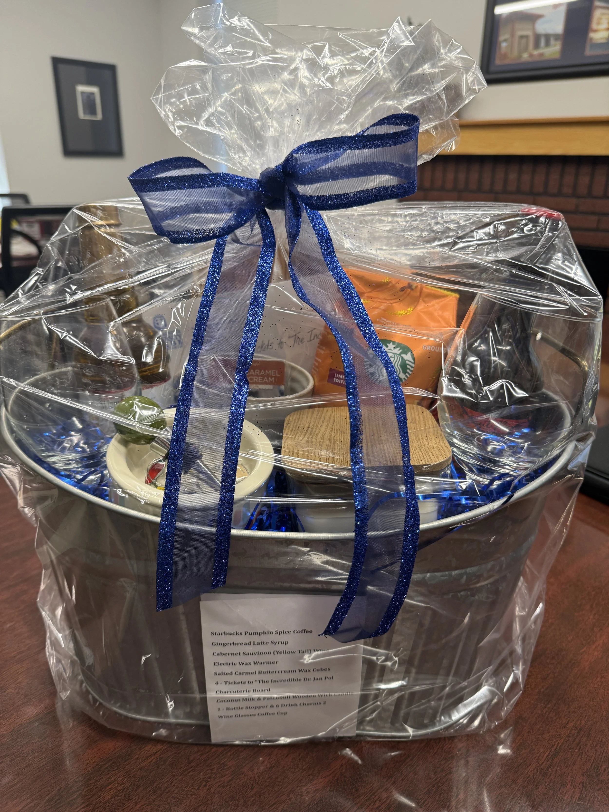 This Fall Favorites Gift Basket is packed with cozy comforts and seasonal treats, including Starbucks Pumpkin Spice Coffee, Gingerbread Latte Syrup, a bottle of Yellow Tail Cabernet Sauvignon, an electric wax warmer with Salted Caramel Buttercream wax cubes, and a Coconut Milk & Patchouli wooden wick candle. Entertain in style with a charcuterie board, two wine glasses, a bottle stopper with six drink charms, and a coffee cup. Plus, enjoy four tickets to The Incredible Dr. Jan Pol. Perfect for relaxing at home or sharing with friends, this basket combines the best flavors, scents, and experiences of the season.