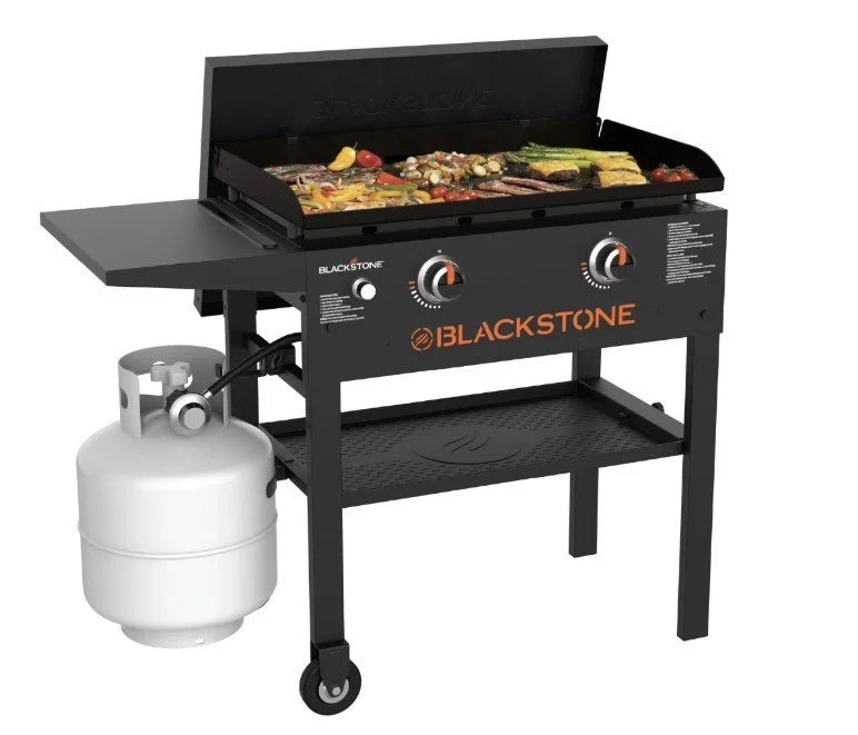 The Blackstone Original 2-Burner 28” Propane Omnivore Griddle with Hard Cover features a griddle plate with built-in wind guards, is designed to heat up quickly and evenly, have better thermal shock stability, and uses less fuel to maintain high heat (24,000 BTUs). The griddle provides a 524 sq. in. cooking area with 2 independently heated cook zones, and includes a protective hard cover to prevent the griddle top from scratching. The side shelf provides extra meal prep and serving space, and the two wheels allow for better maneuverability. The Blackstone-patented Rear Grease Management System offers easy cleanup. Comes with a 1-year limited warranty.